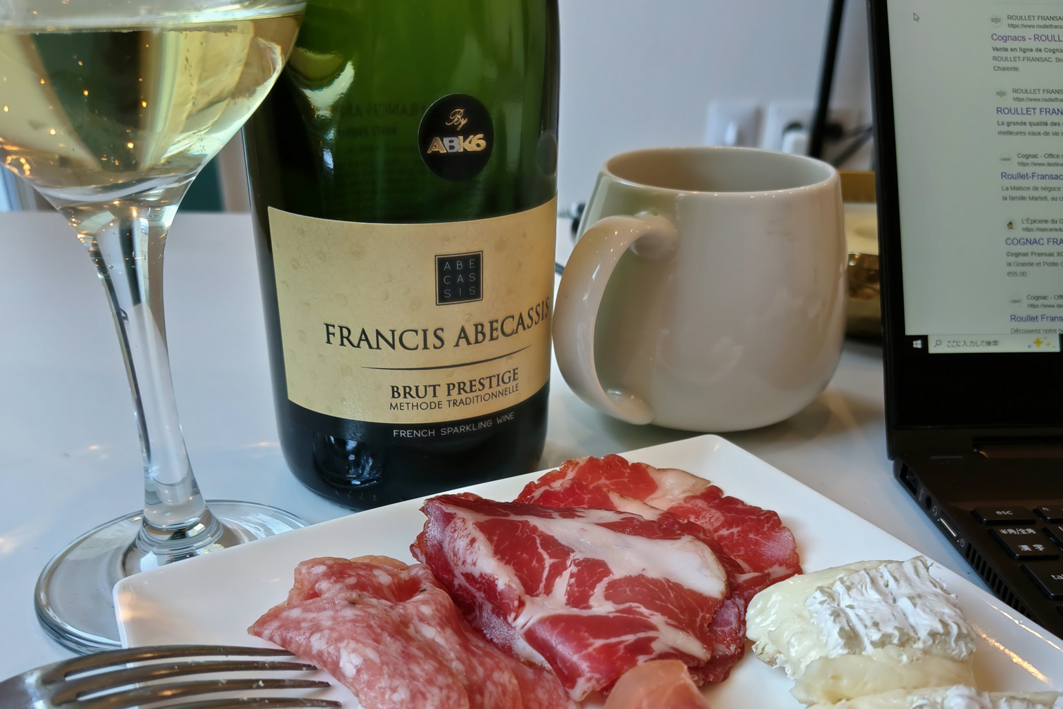 そんなこんなでしばらく部屋でゆっくりした後は流石に疲れたのでささっとシャワーを浴びて途中で購入したパンとハム、チーズ、そして頂きもののABK6コニャックのスパークリングワインを頂きながら優勝して参ります。