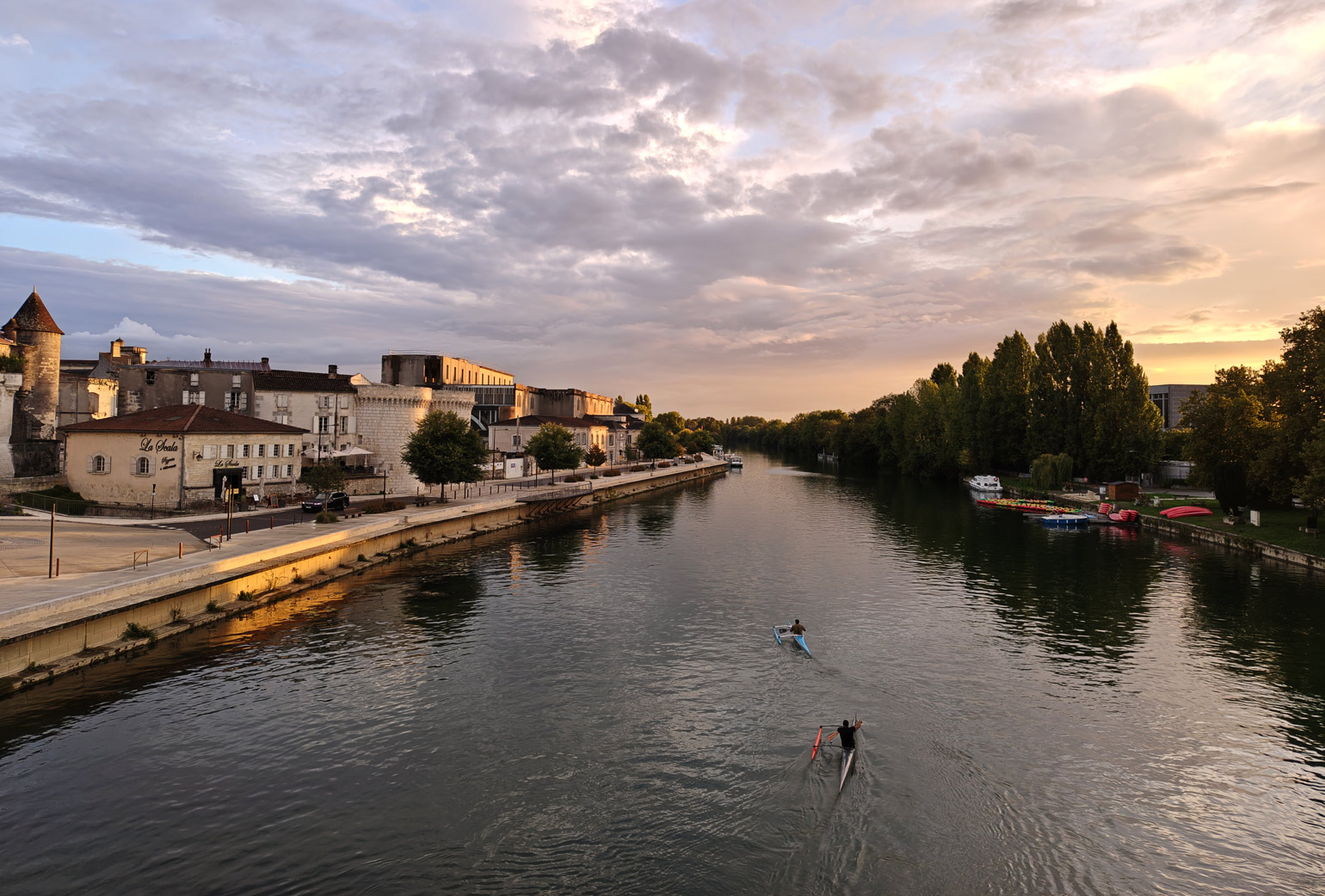 時間は19:30くらい。この時期のコニャックの日の入りは20時過ぎでしたので丁度夕焼けが素晴らしいタイミングでした。シャラント川をカヌーで下る人たちも見受けられます。